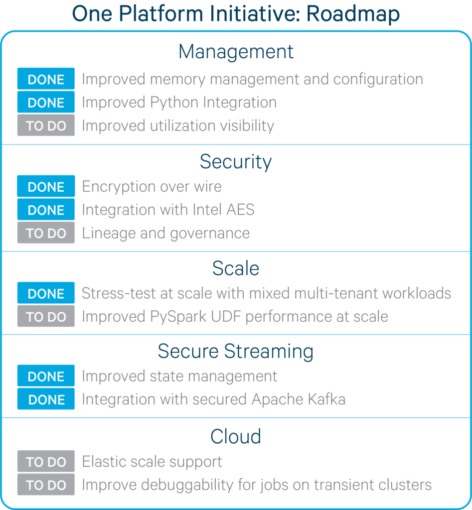 Apache Spark is well-positioned to replace MapReduce as the default data-processing engine in the Hadoop ecosystem, but for customers to fully embrace Spark for all production workloads, there is still work to be done to make it enterprise-grade. Cloudera’s One Platform Initiative focuses on the need to deeply integrate Spark with the Hadoop ecosystem so users get maximum benefits from their big data infrastructure. To achieve this vision, Cloudera’s committers, working alongside the community, will specifically address the issues shown in the diagram to the right (with some items already done).